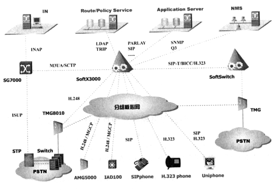 總之,基于IP軟交換的網(wǎng)絡(luò)是一個融合網(wǎng)絡(luò),包括PSTN/ISDN、H.323、ATM/IP等各種網(wǎng)絡(luò)。SIP協(xié)議是NGN多媒體通信協(xié)議,用于軟交換、SIP服務(wù)器和SIP終端之間的通信控制和信息交互,擴展的SIP-T可使SIP消息攜帶ISUP信令;在需要媒體轉(zhuǎn)換的地方可設(shè)置媒體網(wǎng)關(guān),H.248/Megaco為媒體網(wǎng)關(guān)控制器(MGC),用于控制媒體網(wǎng)關(guān),完成媒體轉(zhuǎn)換功能,它并不負責呼叫控制功能;H.323也是多媒體通信協(xié)議,它比SIP、H.248/Megaco的發(fā)展歷史更長,是一項復雜的協(xié)議,升級和擴展性不是很好,SIP+H.248/Megaco可取代H.323,為了與H.323網(wǎng)絡(luò)互通,NGN必須支持該項協(xié)議;SIGTRAN用于解決IP網(wǎng)絡(luò)承載七號信令的問題,它允許七號信令穿過IP網(wǎng)絡(luò)到達目的地;BICC可使ISUP協(xié)議在不同承載網(wǎng)絡(luò)(ATM、IP、PSTN)上傳送。