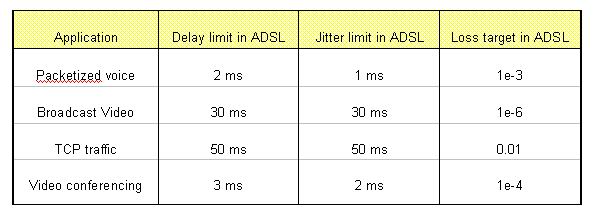 本節(jié)以ADSL承載的幾種典型業(yè)務(wù)為例,討論如何保證不同應(yīng)用的QoS要求。為保證不同應(yīng)用的QoS要求,ADSL設(shè)備可通過對不同的業(yè)務(wù)進行分級,以Diffserv的方式提供不同的分級所需的QoS質(zhì)量。例如可將語音業(yè)務(wù)(VoIP)和視頻會議設(shè)為最高優(yōu)先級,廣播視頻業(yè)務(wù)設(shè)為較高優(yōu)先級,其他如Web瀏覽等業(yè)務(wù)設(shè)為低優(yōu)先級。ADSL設(shè)備為每個優(yōu)先級設(shè)立獨立的隊列,然后采用嚴格優(yōu)先級或帶有權(quán)重的循環(huán)機制控制各優(yōu)先級隊列的輸出。通過調(diào)整不同優(yōu)先級隊列的buffer大小和最長留駐時間,可滿足不同應(yīng)用對時延、抖動、包丟失率的不同要求。