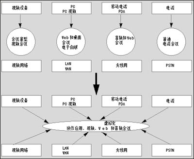 典型的大企業(yè),其電話會議,視頻會議以及網(wǎng)絡(luò)與數(shù)據(jù)會議通常是相互獨(dú)立的系統(tǒng)。UCC可以實現(xiàn)各種通信平臺的協(xié)同工作,員工只需使用一個通用界面便可調(diào)用多種終端設(shè)備。它將視頻會議、音頻會議、短消息以及網(wǎng)絡(luò)接入結(jié)合在一起。還能結(jié)合IP電話功能,如狀態(tài)信息功能等。本專題專門介紹了業(yè)界較為成功的幾種融合視頻概念和產(chǎn)品。
