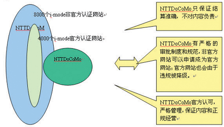 要解決上述問題需要一個(gè)系統(tǒng)化的進(jìn)程,我們可以借鑒NTT DoCoMo的i-mode的管理模式,如圖5所示,這種管理模式的核心思路是將SP分成官方和非官方分別管理,并建立升降級制度,鼓勵SP升級。這樣做的好處是:1.明確運(yùn)營商與SP的關(guān)系;2. 明確用戶投訴的對象;3. 降低SP進(jìn)入門檻,鼓勵SP開發(fā)業(yè)務(wù)。