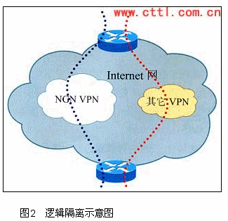 從圖2可以看出,邏輯隔離是在現(xiàn)有的運(yùn)營商數(shù)據(jù)網(wǎng)基礎(chǔ)上,利用已經(jīng)比較成熟的VPN(如MPLSVPN)技術(shù)將網(wǎng)絡(luò)資源進(jìn)行隔離:將網(wǎng)絡(luò)劃分為兩個(gè)邏輯子網(wǎng),一個(gè)是Internet業(yè)務(wù)子網(wǎng),另一個(gè)是NGN業(yè)務(wù)子網(wǎng)。兩個(gè)子網(wǎng)通過VPN進(jìn)行隔離。NGN業(yè)務(wù)與Internet業(yè)務(wù)的區(qū)分在邊緣路由器PE上完成,PE根據(jù)物理接口或邏輯接口區(qū)分業(yè)務(wù)的類型,邏輯接口可以是VLAN,PVC等。在NGN子網(wǎng)中,再有針對的對QoS以及安全等問題進(jìn)行解決。