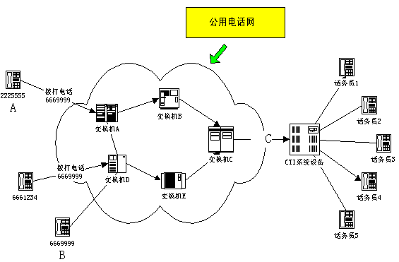 使用該方法,用戶根據(jù)需要將電話轉(zhuǎn)移到CTI系統(tǒng),完全解決了傳統(tǒng)CTI系統(tǒng)采用專用特服號碼服務(wù)所帶來的弊端,其充分利用了傳統(tǒng)電話交換機原有的功能,實現(xiàn)了使用用戶的普通電話號碼完全站在用戶立場的24小時分布式客戶服務(wù),能夠為用戶提供語音、傳真、數(shù)據(jù)及人工服務(wù)等接續(xù)服務(wù)。