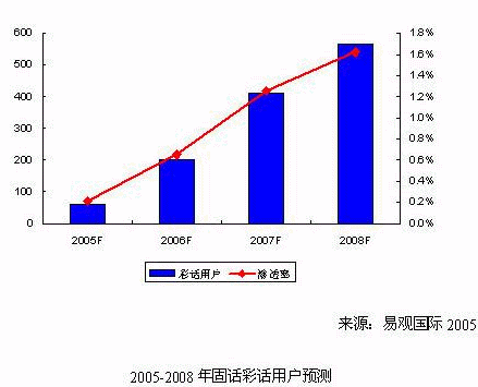 《固網(wǎng)增值業(yè)務(wù)研究系列報告-彩鈴彩話2005》中易觀國際認(rèn)為,固話彩話業(yè)務(wù)將難以像小靈通彩鈴那樣得到廣泛的應(yīng)用,但是能夠在細(xì)分市場中滿足固話用戶的個性化需求。易觀國際預(yù)測,2005年國內(nèi)固話彩話用戶總數(shù)將達到60萬戶,市場規(guī)模為1,000萬元人民幣;到2008年,固話彩話用戶超過550萬戶,市場規(guī)模將超過1.7億元人民幣。