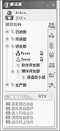 與其他應用程序集成是EIM的發(fā)展趨勢,也是企業(yè)現(xiàn)代辦公的一大需求。目前,騰訊通RTX已成功與國內(nèi)著名的金碟、用友、北京慧點等軟件廠商開展合作,使騰訊通RTX的整體功能進一步提升,極大地方便了企業(yè)應用。比如通過與金碟OA的集成,實現(xiàn)了企業(yè)級實時通信平臺與企業(yè)管理軟件和信息化解決方案的緊密結合,從而更好地滿足客戶需求。通過與用友ERP集成,降低了企業(yè)通信時間和費用,提高了工作效率。