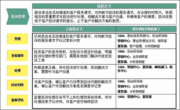 - 流程方面。投訴處理的后臺分屬不同的部門,流程不統(tǒng)一,管理和考核指標也不統(tǒng)一; 投訴等級的標準不明確,各渠道不統(tǒng)一; 缺乏投訴升級流程,缺乏對各流程、各處理環(huán)節(jié)的時限定義。