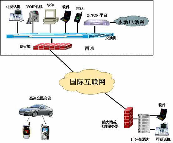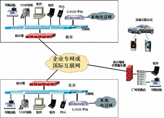 G-NGN-Softswitch產(chǎn)品可以使集團(tuán)用戶(hù)通過(guò)租用網(wǎng)絡(luò)運(yùn)營(yíng)商的寬帶線路,或者直接借助國(guó)際互聯(lián)網(wǎng)組建成連接全市、全省乃至全國(guó)的集團(tuán)內(nèi)部網(wǎng)絡(luò)電話,可以提供可視話機(jī)、非可視話機(jī)、客戶(hù)端軟件、PDA等多種便捷方式實(shí)現(xiàn)集團(tuán)內(nèi)部的可視或非可視通訊。