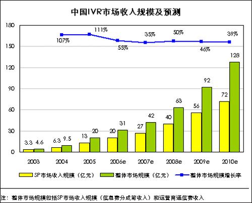 iResearch通過研究分析,2005年中國IVR市場總體收入規(guī)模(包括通信費(fèi)及信息費(fèi))為20億元,2006年將達(dá)到31億元,預(yù)計到2010年將達(dá)到128億元,市場增長率將呈現(xiàn)逐步下降的趨勢。其中IVR市場中SP的收入規(guī)模在2005年為13億元,2006年將達(dá)到20億元。