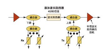 一些基于廣播和選擇結(jié)構(gòu)的ROADM提供了很多波長,可以克服這種結(jié)構(gòu)固有的缺乏波長重用的缺點(diǎn)。流量異常增加需要在某些點(diǎn)重用波長時(shí),可以增加波長阻擋器(見圖2)。