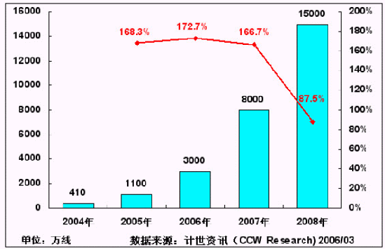 主流運營商NGN網絡的規(guī);ㄔO,為IP Centrex、寬帶電話等新業(yè)務在國內的大規(guī)模應用提供了良好的支撐。計世資訊(CCW Research)預計,在未來3年內,中國的NGN網絡建設規(guī)模將獲得快速增長,到2008年,將有望達到1.5億線的規(guī)模。