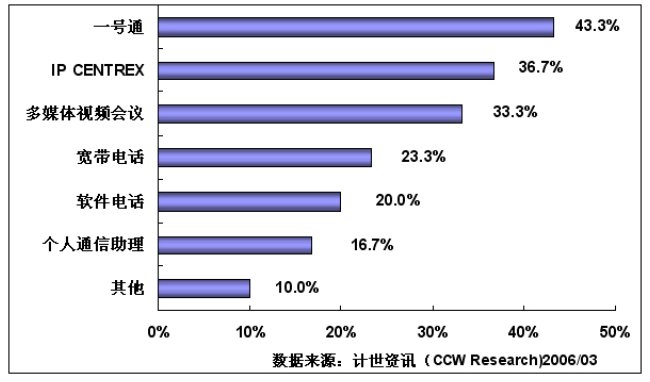 通過計世資訊(CCW Research)的調研可以看到,行業(yè)用戶對一號通、IP-CENTREX、多媒體視頻會議和寬帶電話等基于NGN平臺開發(fā)的業(yè)務比較感興趣,其中:對一號通感興趣的用戶達到43.3%,對IP-CENTREX感興趣的用戶為36.7%,對多媒體視頻會議感興趣的用戶達到33.3%,對寬帶電話感興趣的用戶達到23.3%,對軟件電話感興趣的用戶達到20.0%,對個人通信助理感興趣的用戶達到16.7%。