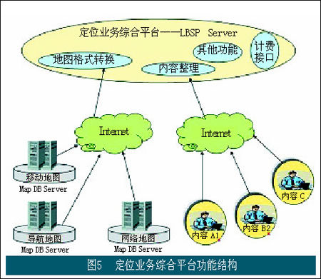 在上述結(jié)構(gòu)中,定位業(yè)務(wù)綜合平臺LBSP扮演著重要角色。其功能結(jié)構(gòu)如圖5所示。在該平臺中提供位置類信息業(yè)務(wù)的業(yè)務(wù)運(yùn)營支撐功能,包括計費(fèi)功能(以及和BOSS系統(tǒng)的接口);同時該平臺還扮演著接入不同內(nèi)容開發(fā)商的重要角色。不同的內(nèi)容開發(fā)和提供商通過該平臺向最終用戶提供具體的業(yè)務(wù)和應(yīng)用,運(yùn)營商通過該平臺對不同內(nèi)容開發(fā)商提供的內(nèi)容進(jìn)行管理和整理,使面向用戶的應(yīng)用能夠順利得到展現(xiàn)。該平臺提供的另一個重要角色是肩負(fù)著接入地圖信息提供商的重任,并在該平臺中通過地圖格式的轉(zhuǎn)換使不同地圖提供商所提供的地圖信息能夠以一致的格式向用戶提供。