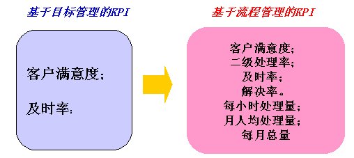 從上圖可看出:原來基于目標(biāo)的KPI更多關(guān)注結(jié)果,而基于流程的KPI不僅關(guān)注結(jié)果,而且更關(guān)注流程效率,基于流程的KPI使所有人員在日常工作中更加關(guān)注和重視流程。
