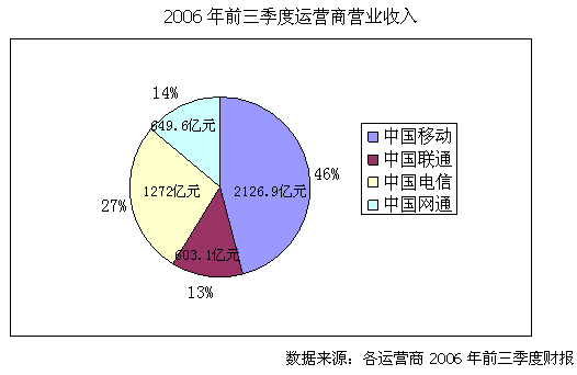 近日,四大運營商紛紛公布2006年前三季度的財務報表,截止9月底中國移動營運收入達到2126.91億元,比上年同期增長20.8%,遠遠高于競爭對手中國聯(lián)通的營業(yè)收入增長5.6%,而固網(wǎng)運營商中國電信和中國網(wǎng)通的收入增長更低,僅為4.5%和2.03%。透過這些數(shù)字,我們看到的是運營商實力差距的進一步拉大。