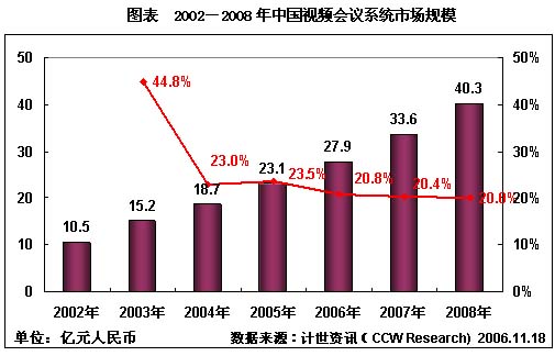 在2003年的井噴式發(fā)展之后,視頻會議系統(tǒng)市場發(fā)展速度開始進(jìn)入低速發(fā)展階段,市場逐漸出現(xiàn)飽和的趨勢。計(jì)世資訊(CCW Research)最新視頻會議報(bào)告數(shù)據(jù)顯示,從2003年非典時(shí)期視頻會議市場井噴式發(fā)展之后,2006年視頻會議系統(tǒng)的增長率開始下降,如何開發(fā)新的產(chǎn)品,成為視頻會議系統(tǒng)市場繼續(xù)發(fā)展的關(guān)鍵。而3G商用的到來,由此產(chǎn)生的移動視頻業(yè)務(wù)也必將成為未來移動通信新的市場增長點(diǎn),可以說,移動信息化建設(shè)將為視頻會議系統(tǒng)開拓一片新的藍(lán)海。