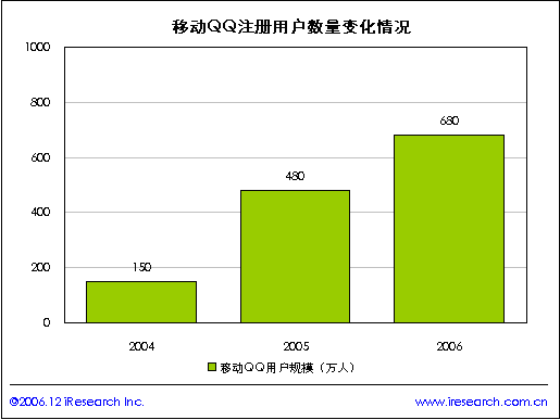近兩年移動(dòng)QQ的市場(chǎng)規(guī)模迅速擴(kuò)大,iResearch研究結(jié)果顯示2006年移動(dòng)QQ用戶(hù)規(guī)模達(dá)到680萬(wàn)人,移動(dòng)QQ所帶來(lái)的現(xiàn)金收入成為騰訊上市公司最重要的收入之一。移動(dòng)IM與互聯(lián)網(wǎng)IM最大的不同在于產(chǎn)業(yè)鏈移動(dòng)運(yùn)營(yíng)商的參與。艾瑞認(rèn)為互聯(lián)互通是移動(dòng)IM產(chǎn)業(yè)整合和發(fā)展必然趨勢(shì)。