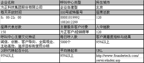 方正呼叫中心是方正服務平臺的重要組成部分,1999年建立,秉承了北大方正“勤備、嚴謹、求實、創(chuàng)新”的精神,依托方正科技“誠信、創(chuàng)新、客戶導向、全局觀念、主動高效、追求目標和賞罰分明”的核心價值觀,以及“全程服務”的品牌文化,以“優(yōu)化服務流程,提高服務質(zhì)量,培育優(yōu)秀品牌,形成競爭優(yōu)勢,創(chuàng)新服務模式,加速業(yè)務增長”作為自己的發(fā)展目標和方向,并學習業(yè)界先進的理念和方法,不斷探索和發(fā)展,多次受到媒體和機構(gòu)的關(guān)注。