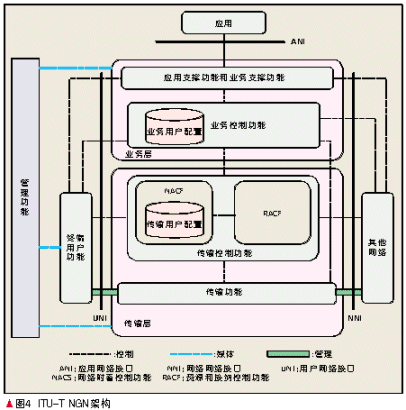 ITU-T下一代網絡的主要架構如圖4所示,NACF是NGN傳輸層的功能實體,正對應于TISPAN NGN架構中的NASS。