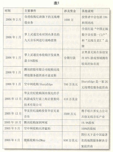 從2003年開始,國內(nèi)就顯現(xiàn)出并購增值服務(wù)運營企業(yè)的苗頭。2004年以來,隨著整治增值服務(wù)運營企業(yè)的力度不斷加大,并購漸成風(fēng)潮(見表1)。2004年2月,新浪收購深圳網(wǎng)興科技公司;2004年5月,搜狐收購手機(jī)WAP服務(wù)提供商北京吉菲爾公司。2005年,在“超級女生”節(jié)目大獲成功后,掌上靈通宣布將對國內(nèi)著名的九天音樂網(wǎng)進(jìn)行戰(zhàn)略投資,全面打造“中國正版數(shù)字音樂第一門戶”和“無線百老匯”品牌。各大移動增值業(yè)務(wù)服務(wù)商通過并購競爭對手,門戶網(wǎng)站可以在移動增值服務(wù)領(lǐng)域?qū)で笮碌耐黄,獲得可觀的利益,增強(qiáng)自身的競爭力。伴隨著3G商用的日益臨近和市場競爭的不斷加劇,主流SP(服務(wù)提供商)進(jìn)一步加快了資本購并和業(yè)務(wù)整合的步伐,整個SP行業(yè)將加速洗牌。經(jīng)過市場整合,主流SP將不斷做大做強(qiáng),而相當(dāng)多的缺乏市場競爭力的SP將被淘汰出局。