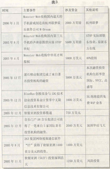 近幾年來,一些資本投資商將投資的重點放到了無線音樂、手機(jī)游戲和手機(jī)視訊等業(yè)務(wù)領(lǐng)域,逐步加大了對SP的投資力度(見表3)。進(jìn)入2005年以來,著眼于2.5G向3G的全面演進(jìn),風(fēng)險投資對SP的投資力度進(jìn)一步加大。以滾石移動為例,在2002年和2004年獲得兩輪風(fēng)險投資之后,滾石移動憑借在無線音樂領(lǐng)域取得的良好市場業(yè)績,又獲得了智基創(chuàng)投、華登國際、聯(lián)想投資等公司的投資,投資金額達(dá)3000萬美元。繼2004年10月獲得IDG投資以后,2005年12月7日,國內(nèi)著名的數(shù)字音樂門戶——A8音樂集團(tuán)獲得了包括IDG和Intel投資公司在內(nèi)的5家國際著名投資機(jī)構(gòu)的投資,投資金額達(dá)2000萬美元。同月,掌中無限則獲得了來自全球性風(fēng)險投資商BlueRun創(chuàng)投基金和IDG總額達(dá)上千萬美元的投資。