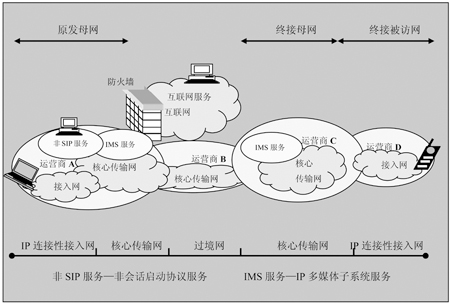 如圖3所示,與一個(gè)被訪問的網(wǎng)不同,IP多媒體子系統(tǒng)還支持母網(wǎng)的概念。在這個(gè)例子中,母網(wǎng)是支持具有登錄權(quán)的IP多媒體子系統(tǒng)的核心網(wǎng)。被訪問的網(wǎng)是當(dāng)前向用戶提供IP多媒體子系統(tǒng)服務(wù)連接的網(wǎng)。圖3中的運(yùn)營(yíng)商A擁有許多疊接網(wǎng)用戶的母網(wǎng),而運(yùn)營(yíng)商C擁有移動(dòng)電話的母網(wǎng),而用戶正在運(yùn)營(yíng)商D的網(wǎng)絡(luò)中漫游。