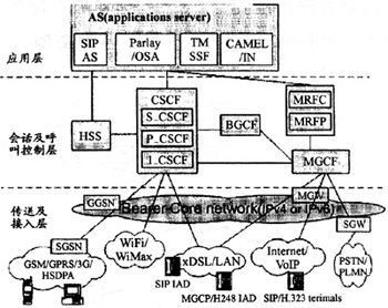 一般IMS分為三層,應(yīng)用層支持各類應(yīng)用服務(wù)器,負責(zé)為用戶提供增值業(yè)務(wù)和第三方業(yè)務(wù)。會話及呼叫控制層負責(zé)管理呼叫或會話設(shè)置,其中呼叫會話控制模塊CSCF完成呼叫網(wǎng)關(guān)功能、呼叫業(yè)務(wù)觸發(fā)功能和路由選擇功能,將SIP信令消息正確地轉(zhuǎn)發(fā)到應(yīng)用服務(wù)器。歸屬用戶服務(wù)器HSS用于維護每個終端用戶獨有的業(yè)務(wù)屬性,包括IP地址、漫游信息、好友列表、呼叫業(yè)務(wù)定制信息及語音郵件設(shè)置等。HSS是全網(wǎng)可用資源。媒體資源功能MRF包括MRFP和MRFC,負責(zé)提供及控制媒體流資源,如播放通知音、媒體流的混合、編解碼等。媒體網(wǎng)關(guān)控制MGCF負責(zé)PSTN承載與IP流之間的連接,根據(jù)被叫號碼和來話情況選擇CSCF,并完成PSTN與IMS之間的呼叫控制協(xié)議轉(zhuǎn)換,如將從CSCF接收到的SIP消息轉(zhuǎn)換為MEGACO或ISUP消息,并通過IP發(fā)送到信令網(wǎng)關(guān)SGW。出口網(wǎng)關(guān)控制功能BGCF主要實現(xiàn)呼叫路由功能,為呼叫選擇適當?shù)腜STN接口點,若發(fā)現(xiàn)該接口點與自己在同一網(wǎng)絡(luò),則選擇本網(wǎng)絡(luò)的MGCF與PSTN交互,若發(fā)現(xiàn)接口點在另一網(wǎng)絡(luò)時,BGCF將會話信令轉(zhuǎn)發(fā)給另一網(wǎng)絡(luò)相應(yīng)的BGCF。一個IMS可以包含一個或多個CSCF、HSS、MGCF等功能模塊。傳送及接入層承載各種類型之間的轉(zhuǎn)換,完成與傳統(tǒng)PSTN/PLMN間的互通等功能,包括各類有線接入、無線接入、互聯(lián)互通網(wǎng)關(guān)等設(shè)備。