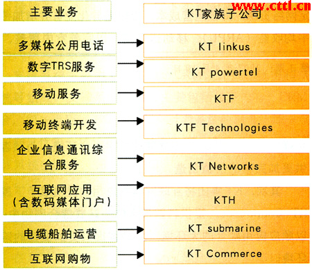 目前,KT集團(tuán)是全業(yè)務(wù)運(yùn)營(yíng)商,同時(shí)也是韓國(guó)最大的固網(wǎng)運(yùn)營(yíng)商,它在FMC領(lǐng)域最大動(dòng)作就是BcN寬帶融合網(wǎng)絡(luò),這是韓國(guó)政府為確保韓國(guó)在IT和電信技術(shù)市場(chǎng)持續(xù)領(lǐng)先地位而實(shí)行的IT839計(jì)劃的核心環(huán)節(jié)之一。BcN目的是要將有線與無(wú)線系統(tǒng)、通信和廣播系統(tǒng)融合在一起,為企業(yè)用戶(hù)和個(gè)人用戶(hù)提供一個(gè)共同的渠道收發(fā)語(yǔ)音、文本、圖像和視頻文件。為此,KT集團(tuán)順著新的價(jià)值鏈,對(duì)集團(tuán)內(nèi)部分機(jī)構(gòu)的功能進(jìn)行了調(diào)整,其主要組織架構(gòu)如圖2所示: