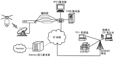 。。WiMAX網絡支持豐富多彩的業(yè)務模式。不同速率的數據業(yè)務是網絡的主要承載目標。WiMAX支持不同的QoS級別,因此網絡覆蓋范圍與業(yè)務類型緊密相關。在IPTV的接入方面,由于IPTV需要高級別的QoS保證以及高速的數據傳輸速率,所以根據小區(qū)內用戶的數量以及需求,合理設置WiMAX網絡。用戶接入IPTV網絡的時候。不需要再次進行布線,只需加裝WiMAX接收設備和IP機頂盒即可,因此用戶可以方便、快捷地使用IPTV業(yè)務。WiMAX實現(xiàn)IPTV的接入如圖1所示。