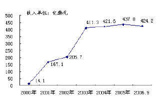 經(jīng)過6年多的運營,韓國電信的eBilling業(yè)務發(fā)展良好,目前與其合作的ICP已達到500多家,內容涵蓋了收費郵箱、在線軟件銷售、聊天、娛樂、游戲、漫畫、綜合信息等;業(yè)務收入也逐年上升,從2000年的14.1億韓元(折合人民幣0.11億元)增長到2006年9月份的424.2億韓元(折合人民幣3.3億元),如圖2、圖3所示。