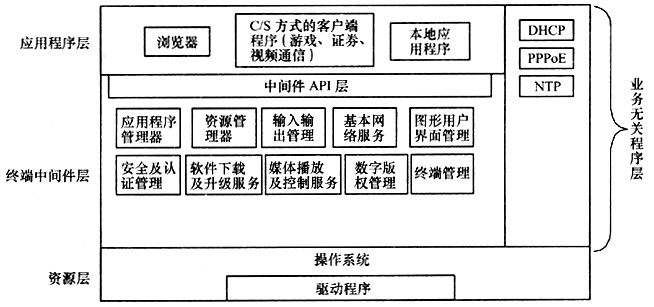 業(yè)務(wù)無(wú)關(guān)程序?qū)樱喊ǜ鞣N直接運(yùn)行在操作系統(tǒng)之上,與IPTV業(yè)務(wù)無(wú)關(guān)的程序,如DHCP、PPPoE接入認(rèn)證程序等。程序直接運(yùn)行在OS之上,可以提高運(yùn)行效率。這些程序與終端中間件軟件一樣,在引入新的機(jī)頂盒時(shí)要進(jìn)行移植,但這些程序通常具有業(yè)務(wù)無(wú)關(guān)性,遵循通用的接口協(xié)議,因此能做到快速移植。
