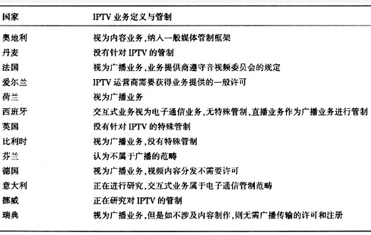 歐盟在1997年發(fā)表的融合綠皮書《邁向信息社會(huì)之路》中明確指出不同的網(wǎng)絡(luò)平臺(tái)都能一同傳送電話信息、電視信息、電腦信息和數(shù)據(jù),并于2003年開(kāi)始實(shí)施《電子通信網(wǎng)絡(luò)與服務(wù)的統(tǒng)一監(jiān)管框架》,1997年融合指令和2003年統(tǒng)一監(jiān)管框架推動(dòng)了歐盟各國(guó)業(yè)務(wù)融合的發(fā)展,歐盟大多數(shù)國(guó)家均開(kāi)放了有線電視和電信市場(chǎng),允許彼此進(jìn)入。在實(shí)現(xiàn)管制融合的國(guó)家,對(duì)電信運(yùn)營(yíng)商提供IPTV基本沒(méi)有準(zhǔn)入方面的限制。但是由于各國(guó)對(duì)IPTV定義和認(rèn)識(shí)的不同。IPTV所屬的業(yè)務(wù)類別也有所差異,從而帶來(lái)了管制上的差別。