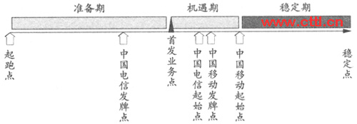 此版本是表示中國(guó)移動(dòng)進(jìn)入3G業(yè)務(wù)運(yùn)營(yíng)早于競(jìng)爭(zhēng)對(duì)手。圖4根據(jù)中國(guó)移動(dòng)和中國(guó)電信發(fā)放牌照的不同時(shí)期而將全業(yè)務(wù)運(yùn)營(yíng)市場(chǎng)策略劃分成準(zhǔn)備期、機(jī)遇期和穩(wěn)定期。
