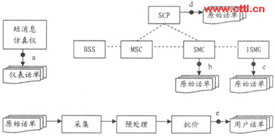 通過對移動點對點短消息計費原理的分析,可以把整個計費過程劃分為兩大環(huán)節(jié):計費點原始話單的生成和后期計費處理系統(tǒng)的處理。如果其中任何一個環(huán)節(jié)出現(xiàn)差錯都會降低用戶計費話單的準確性。因此在測試過程中采取了用戶層面和設備層面相結(jié)合的方法:一方面使用仿真儀表大量模擬點對點短消息的發(fā)送和接收,得到用戶話單;一方面分析各個計費點生成的原始話單。