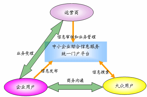 “中小企業(yè)綜合信息服務(wù)統(tǒng)一門戶平臺(tái)”的角色包括:運(yùn)營商、企業(yè)用戶、大眾用戶三大角色。各角色與平臺(tái)之間及角色之間的業(yè)務(wù)關(guān)系如下: