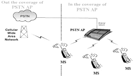 如圖3所示,使用藍牙CTP MS(mobile station)和PSTN AP,通過本地交換機與固網(wǎng)相連。其中,MS為雙模終端,可以根據(jù)不同網(wǎng)絡的資費差異預先設置采用何種網(wǎng)絡接打電話。在藍牙覆蓋范圍內(nèi),根據(jù)設置,CTP