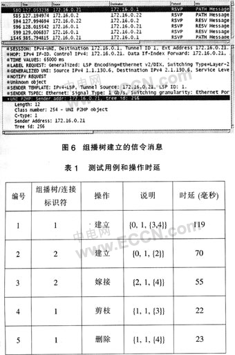 1出發(fā)的組播樹和單播連接,結(jié)果如表1所列。圖6顯示了Ethereal捕獲的組播樹建立的信令消息。在解開的Path消息中,可以發(fā)現(xiàn)經(jīng)過擴展的UNI組播對象。然后,對已存在的連接進行了動態(tài)的修改。在第三個測例中,一個葉子被添加到單播連接上并使其變?yōu)橐豢媒M播樹。在嫁接和剪枝的操作中,業(yè)務(wù)生成器在已建立的連接上沒有觀察到丟包的現(xiàn)象。