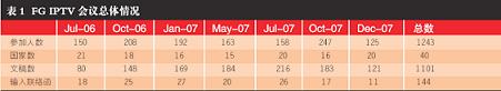 FGIPTV在一年半的時(shí)間里共召開了7次會議,收到了1101篇文稿,參加者包括來自40個(gè)國家的1243名專家(見表1),其中既包括傳統(tǒng)電信網(wǎng)的專家,也包括來自廣播電視行業(yè)、IT業(yè)的專家,通過這7次會議、提交的文稿以及專家們的貢獻(xiàn),一方面產(chǎn)生了IPTV的定義,另一方面也形成了21個(gè)工作文檔,并根據(jù)這些文檔的內(nèi)容確定了負(fù)責(zé)此文檔的相應(yīng)研究組和課題(即Q/SG),詳見表2。