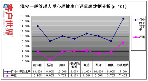目前,員工壓力和心理健康情況已成為困擾整個行業(yè)的主要問題之一,我們通過專業(yè)方法對淮安中心的員工心理健康和壓力狀況進(jìn)行了科學(xué)的測量,以了解該中心員工的壓力和心理健康狀況,具體測量數(shù)據(jù)如下: