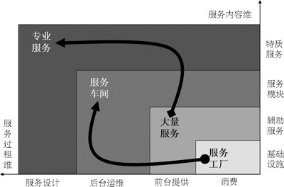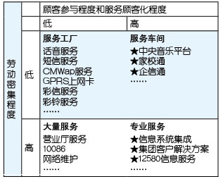 表1中以“★”標(biāo)識的服務(wù)基本上都是電信運(yùn)營企業(yè)開展移動(dòng)信息化后向客戶提供的服務(wù),可以明顯看出,更高的顧客參與度、更多的顧客化是這些服務(wù)的共同特點(diǎn),所以,移動(dòng)信息化運(yùn)營的就是由服務(wù)工廠向服務(wù)車間轉(zhuǎn)型、由大量服務(wù)向?qū)I(yè)服務(wù)轉(zhuǎn)型。