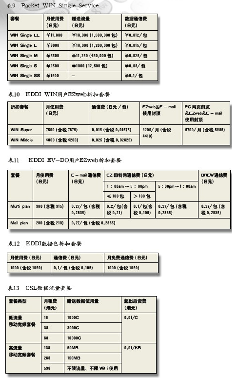 用戶使用WIN au手機,通信包標準計費為0.1日元/包(Packet)(含稅0.105日元),其中1Packe=128Bytes。KDDI為用戶提供分檔包月套餐,見表9。