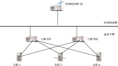 四川電信時(shí)間同步網(wǎng)對數(shù)據(jù)網(wǎng)元的授時(shí),統(tǒng)一采用設(shè)置三級時(shí)間服務(wù)器方式。該方式須在數(shù)據(jù)網(wǎng)元內(nèi)部選定一臺(tái)或兩臺(tái)機(jī)器作為三級TS,三級TS同步到時(shí)間同步網(wǎng)的時(shí)間服務(wù)器,系統(tǒng)內(nèi)的其他主機(jī)與三級TS保持同步,如圖2所示。