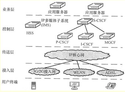 IMS使用會話發(fā)起協(xié)議(SIP)作為建立、控制、修改和終止兩個或者更多個參與者之間的語音、視頻和消息等會話的信令協(xié)議。在IMS中,與SIP相關(guān)的信令點稱為呼叫狀態(tài)控制功能信令點,并且根據(jù)它們功能的不同而有所區(qū)分。IMS中與鑒權(quán)、授權(quán)、計費(fèi)相關(guān)的功能基于IETF、Diameter協(xié)議,是在HSS、CSCF等IMS組件上實現(xiàn)的,提供業(yè)務(wù)收費(fèi)功能。HSS是與用戶和服務(wù)相關(guān)的數(shù)據(jù)的主要存儲器,由2G移動通信網(wǎng)的HLR演進(jìn)而來。業(yè)務(wù)層上的應(yīng)用服務(wù)器提供各種業(yè)務(wù)邏輯,實現(xiàn)多種電信增值業(yè)務(wù)。傳送層的IP核心網(wǎng)是IMS業(yè)務(wù)的統(tǒng)一承載網(wǎng)絡(luò)。接入層提供包括2G、3G(UMTS、cdma2000)、WLAN、ADSL等在內(nèi)的多種接入方式。