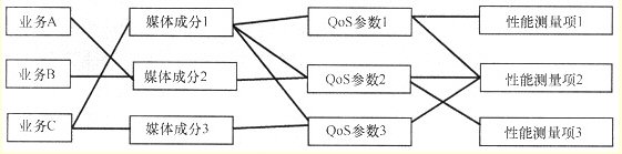 對于基于IMS的下一代網(wǎng)絡(luò)來說,QoS參數(shù)和業(yè)務(wù)的相關(guān)關(guān)系比較復(fù)雜。對于一個IMS業(yè)務(wù),需要保障其包含的所有的媒體成分的服務(wù)質(zhì)量。將IMS業(yè)務(wù)的QoS要求分解為可測量的網(wǎng)絡(luò)參數(shù)的過程如圖2所示。