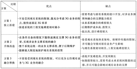 由于國(guó)內(nèi)電信運(yùn)營(yíng)商一般已建有業(yè)務(wù)支撐系統(tǒng),因此在進(jìn)入到3G時(shí)代后就面臨著如何選擇3G融合計(jì)費(fèi)系統(tǒng)建設(shè)方式的問(wèn)題。3G融合計(jì)費(fèi)系統(tǒng)的建設(shè)方案主要有獨(dú)立新建、升級(jí)改造、融合替換三種。三種不同的建設(shè)方案對(duì)比分析見(jiàn)表2。