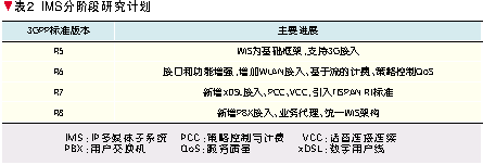 3GPP依照UMTS 3G移動通信系統(tǒng)的系列標(biāo)準(zhǔn)版本定義了IMS的分階段演進計劃[5],如表2所示。其中,2002年完成的R5是第一個全I(xiàn)P移動網(wǎng)絡(luò)標(biāo)準(zhǔn),它將核心網(wǎng)歸為一個統(tǒng)一的基于IP的分組(PS)域,具有服務(wù)質(zhì)量(QoS)保證,能夠提供各種類型的多媒體增值業(yè)務(wù),其核心技術(shù)標(biāo)準(zhǔn)就是IMS。R6進一步完善IMS接口和功能,增加對于WLAN的接入支持,并研究IMS域的計費和QoS控制技術(shù)。R7融合TISPAN關(guān)于NGN的研究標(biāo)準(zhǔn),增加對于xDSL接入技術(shù)的支持,提出策略控制與計費(PCC)技術(shù)以及WLAN/3G語音連續(xù)通信的話音連接連續(xù)(VCC)技術(shù)。正在研究中的R8將協(xié)同各個標(biāo)準(zhǔn)化組織的工作,研究支持組合業(yè)務(wù)的業(yè)務(wù)代理技術(shù)以及下一步的統(tǒng)一IMS架構(gòu)。