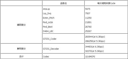 經(jīng)過C語言級和匯編級的多種優(yōu)化,最后實現(xiàn)了一路G.723.1的編解碼需要花費10.6MCPS,整個代碼的程序空間為208K byte(程序中包括了部分c6201的庫函數(shù)),數(shù)據(jù)空間為8K byte,碼本大小20k byte,多通道的上下文數(shù)據(jù)為1.48K byte。200MHz的C6201每秒可以實時編解碼16路語音信號。所有代碼全部通過了ITU-T測試矢量的測試。表1是各主要模塊的運算量。