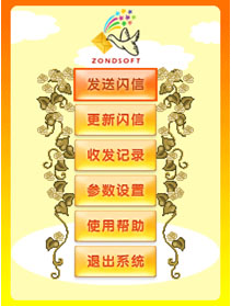 “閃信”的主操作界面設(shè)計(jì)簡(jiǎn)潔、顏色以明快的橙色位置。功能選項(xiàng)整齊的排列在屏幕中央。功能項(xiàng)共分為6大項(xiàng)“發(fā)送閃信、收發(fā)記錄、更新閃信、參數(shù)設(shè)置、使用幫助、退出系統(tǒng)”功能項(xiàng)的設(shè)置簡(jiǎn)潔,功能名稱使人看過(guò)之后就可以迅速理解了各個(gè)選項(xiàng)的功能重點(diǎn)。