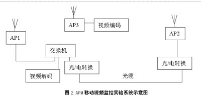 為了保證APM移動視頻監(jiān)控系統(tǒng)的整體性能,筆者就APM系統(tǒng)無線網(wǎng)絡(luò)和視頻編碼器的各自性能,進(jìn)行了實驗。本次實驗采用兩個步驟,即實驗室測試和現(xiàn)場模擬實驗測試,并在實驗室測試的基礎(chǔ)上,對無線網(wǎng)絡(luò)和視頻編碼器間的初步配合進(jìn)行現(xiàn)場實驗測試,F(xiàn)場的實驗系統(tǒng)組成如圖2所示。