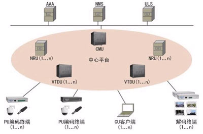 單級系統(tǒng)組網(wǎng)架構(gòu)如上圖所示。主要包括前端單元PU、客戶端單元CU、中心平臺(包括CMU、VTDU、NRU)以及支撐系統(tǒng)(包括AAA、ULS和NMS),各部分均接入IP