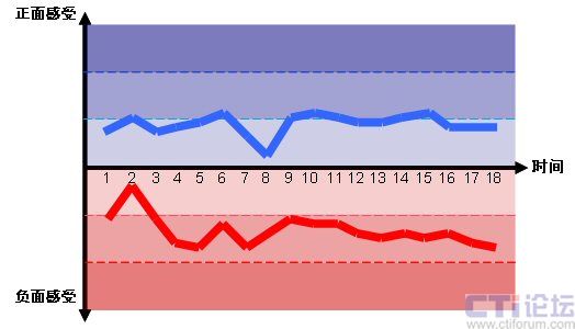 圖2的情感曲線分別是中國(guó)移動(dòng)的“喜愛”情感曲線和中國(guó)電信的“討厭”情感曲線,對(duì)應(yīng)于雙方整個(gè)呼入電話體驗(yàn)18個(gè)子流程上的情感感受。(注意,我們只列出了中國(guó)移動(dòng)的“喜愛”曲線和中國(guó)電信的“討厭”曲線來舉例說明。)