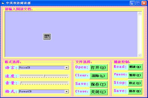、“清除(L)” 、“保存(T)”和“關(guān)閉(C)” ,分別用來打開要閱讀的文件、清除MainTxtBox中的內(nèi)容、保存MainTxtBox中的內(nèi)容和關(guān)閉中英文閱讀器;在Frame4添加四個(gè)Label控件,將它們的Caption分別命名為分別“Speak”